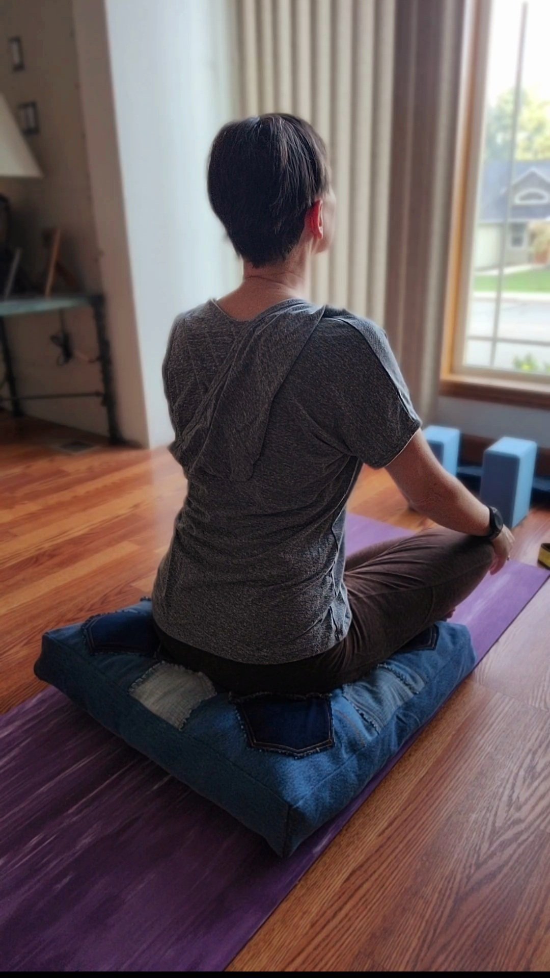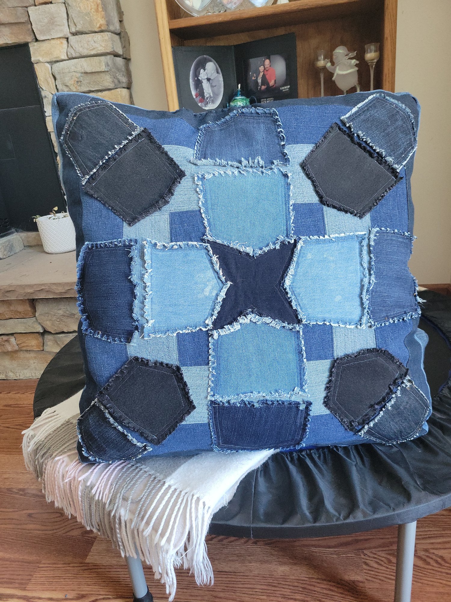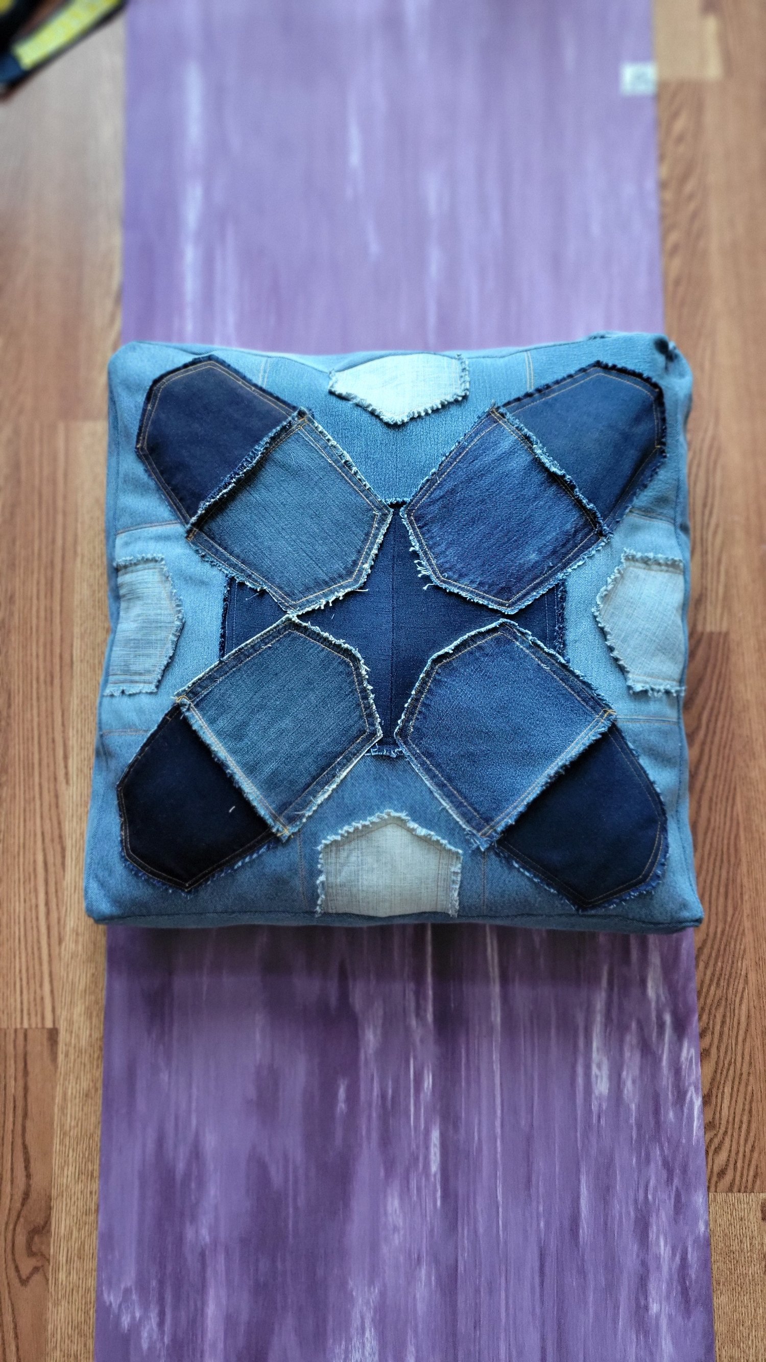 This one-of-kind pillow is perfect for your meditation needs. Stuffed with washable polyester fiber filling. The reverse side is made of distressed denim shaped-like pockets also in a Kaleidoscope type pattern.