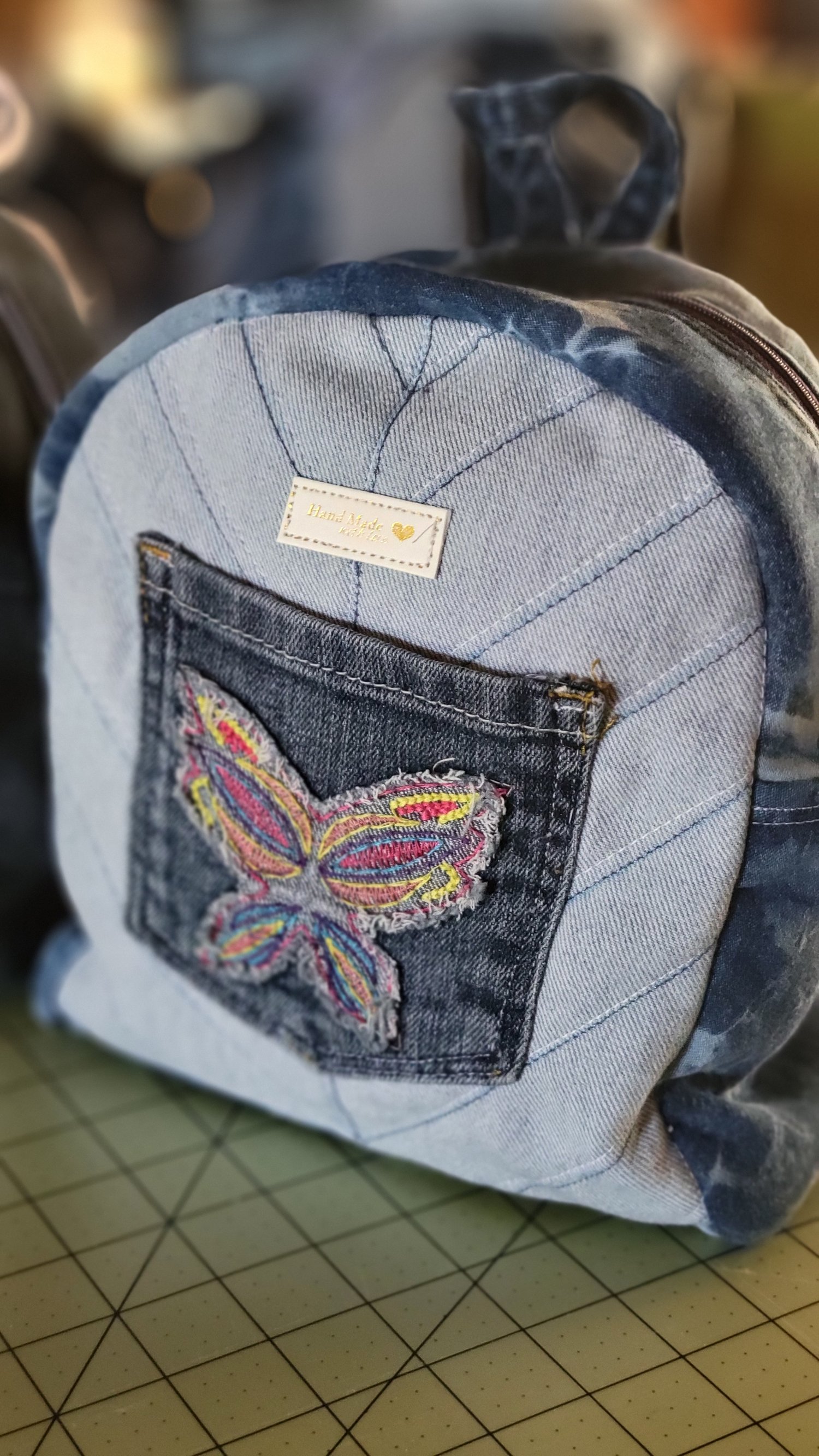 This one-of-kind backpack has multicolored denim pieces with a embroidered butterfly design on two outside pockets.