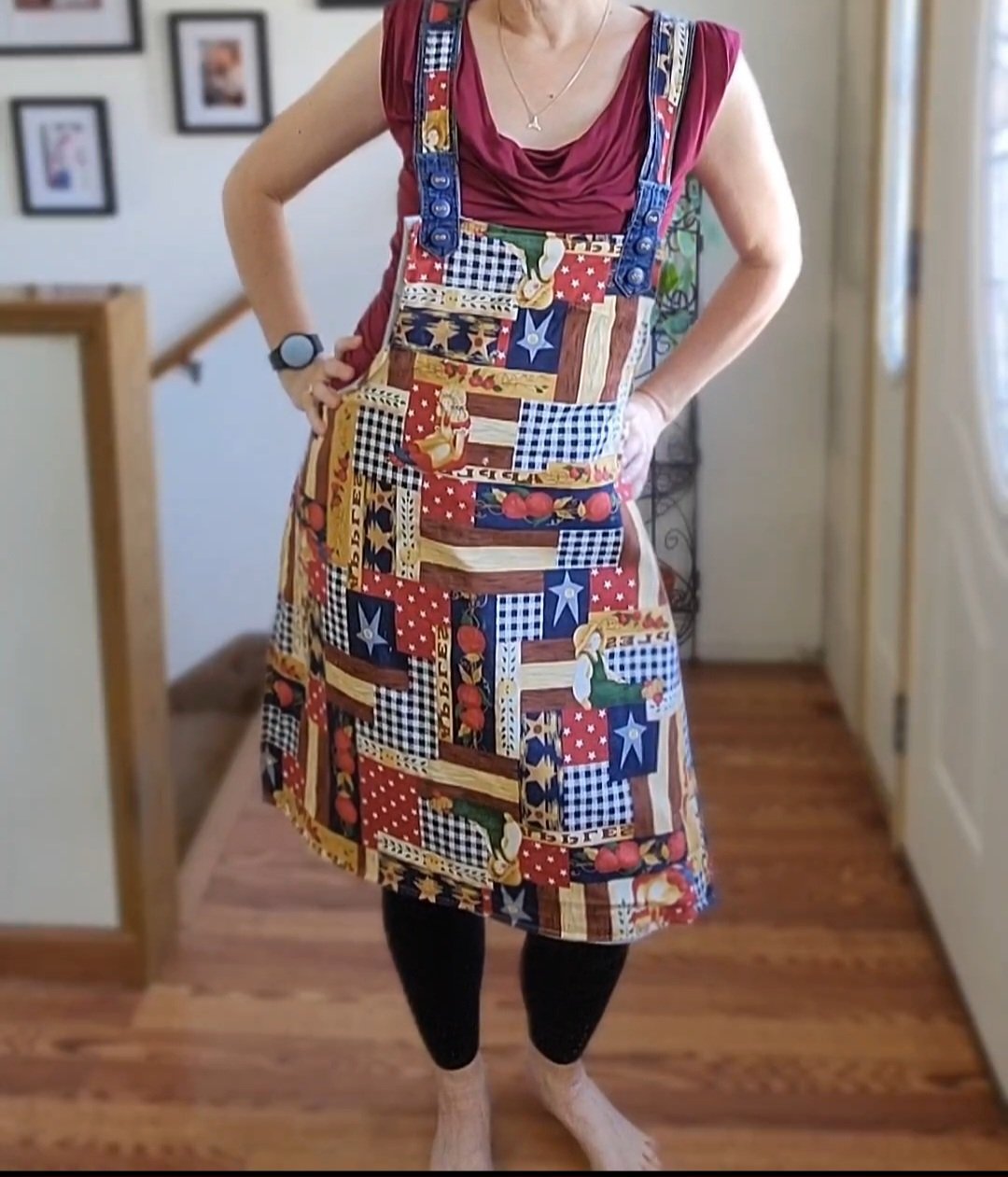 This beautiful apron is put together with multiple colors of denim. It has three functional pockets on the denim side. The reverse side is 100% cotton with a country apple theme.