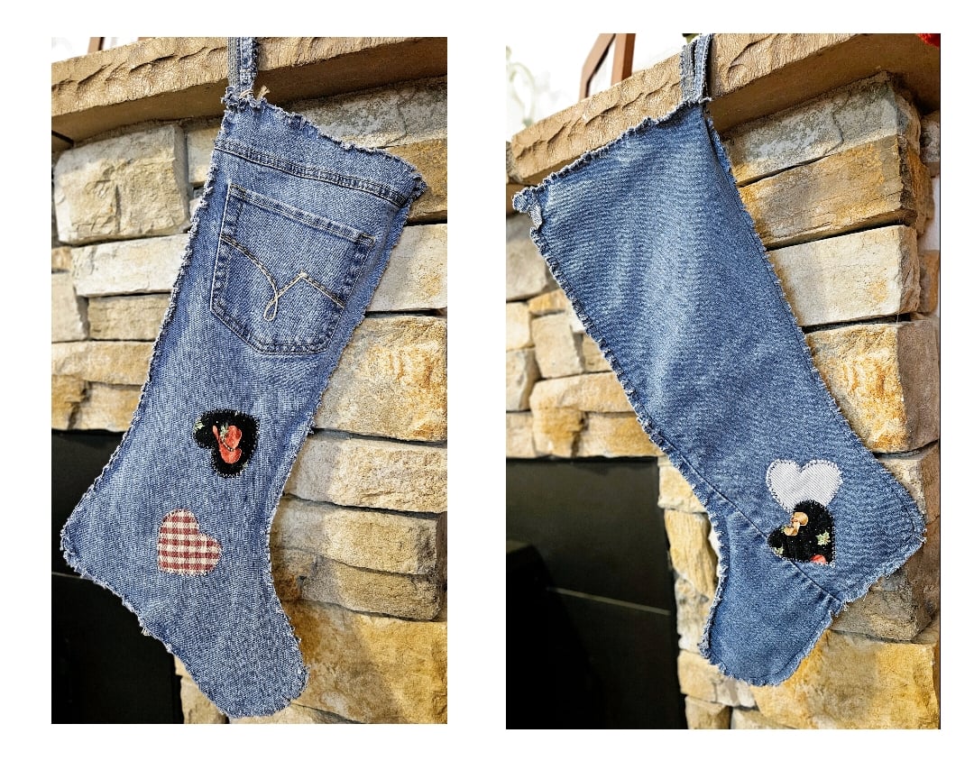 These denim stockings are a new fun addition to your holiday decor. Functional pockets, acrylic painting done by hand, lined with 100% cotton in a Christmas theme, with a loop to hang them over your fireplace or wherever you please.