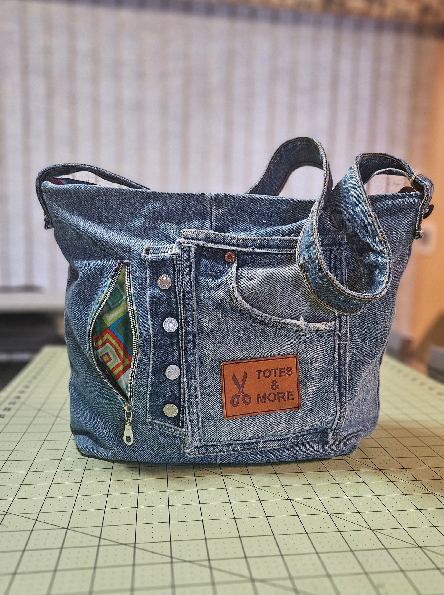 Love your jeans? This one of a kind handbag has five outside functional pockets. One of which has a zipper and fun jean buttons that accent this cool bag.
