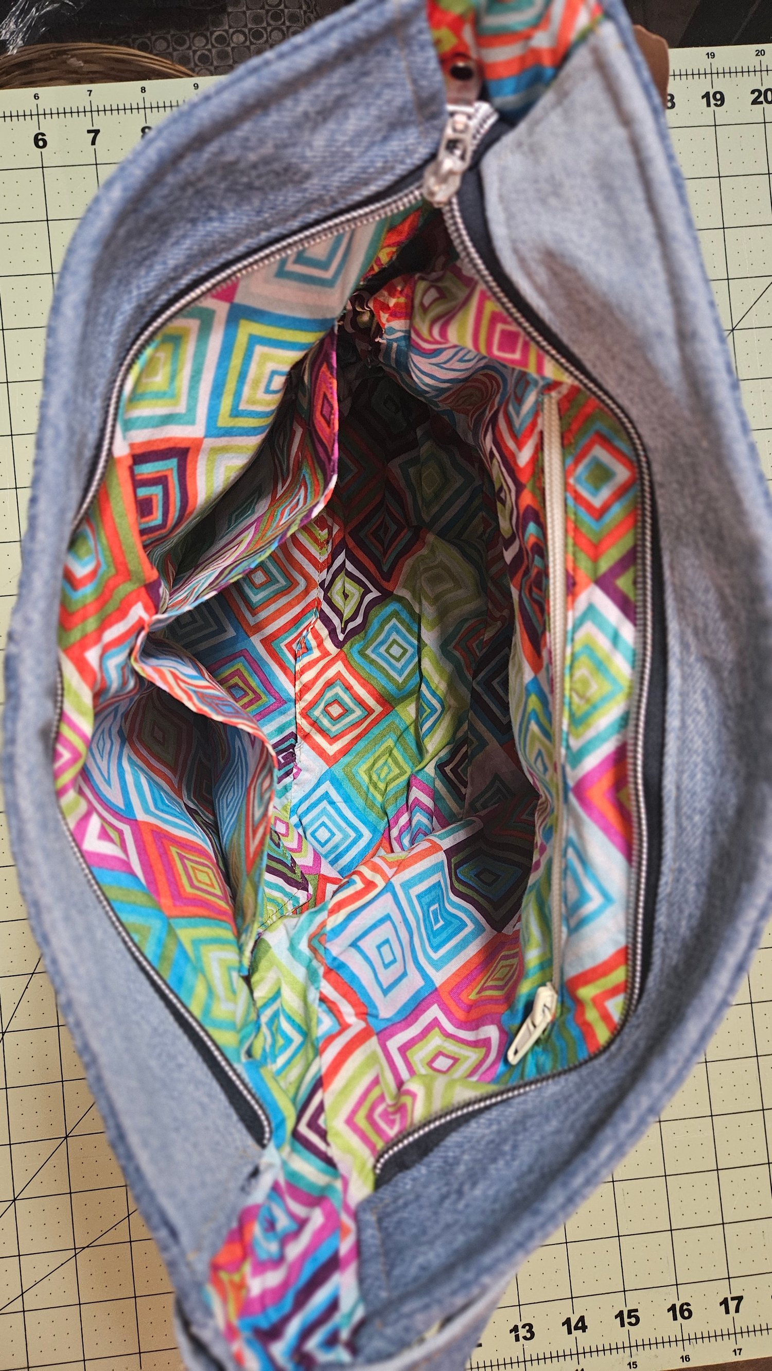 This handbag has a main zipper closure with a denim waistband for a handle for more durability. The multi-colored lining is 100% recycled cotton.